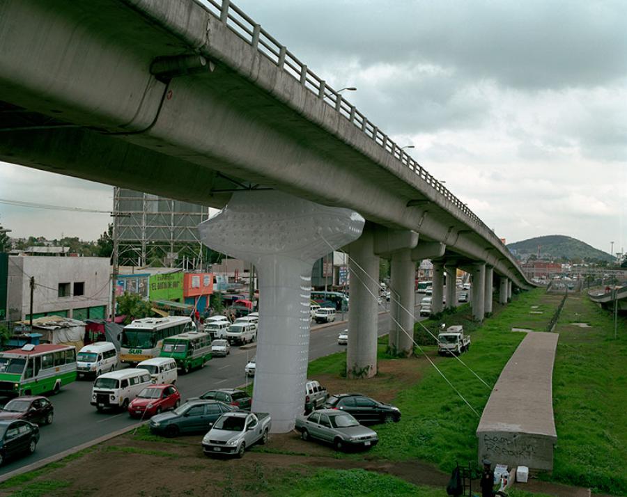 The project is based on a variety of plastic wrappings with various forms and capacities. Such wraps act as containers of gaseous residuals expelled through the exhaust of several internal combustion vehicles that are running. The work outstands the close and reciprocal relationship between those machines and the city from their potential to visualize contaminants that occupy a place on the space.