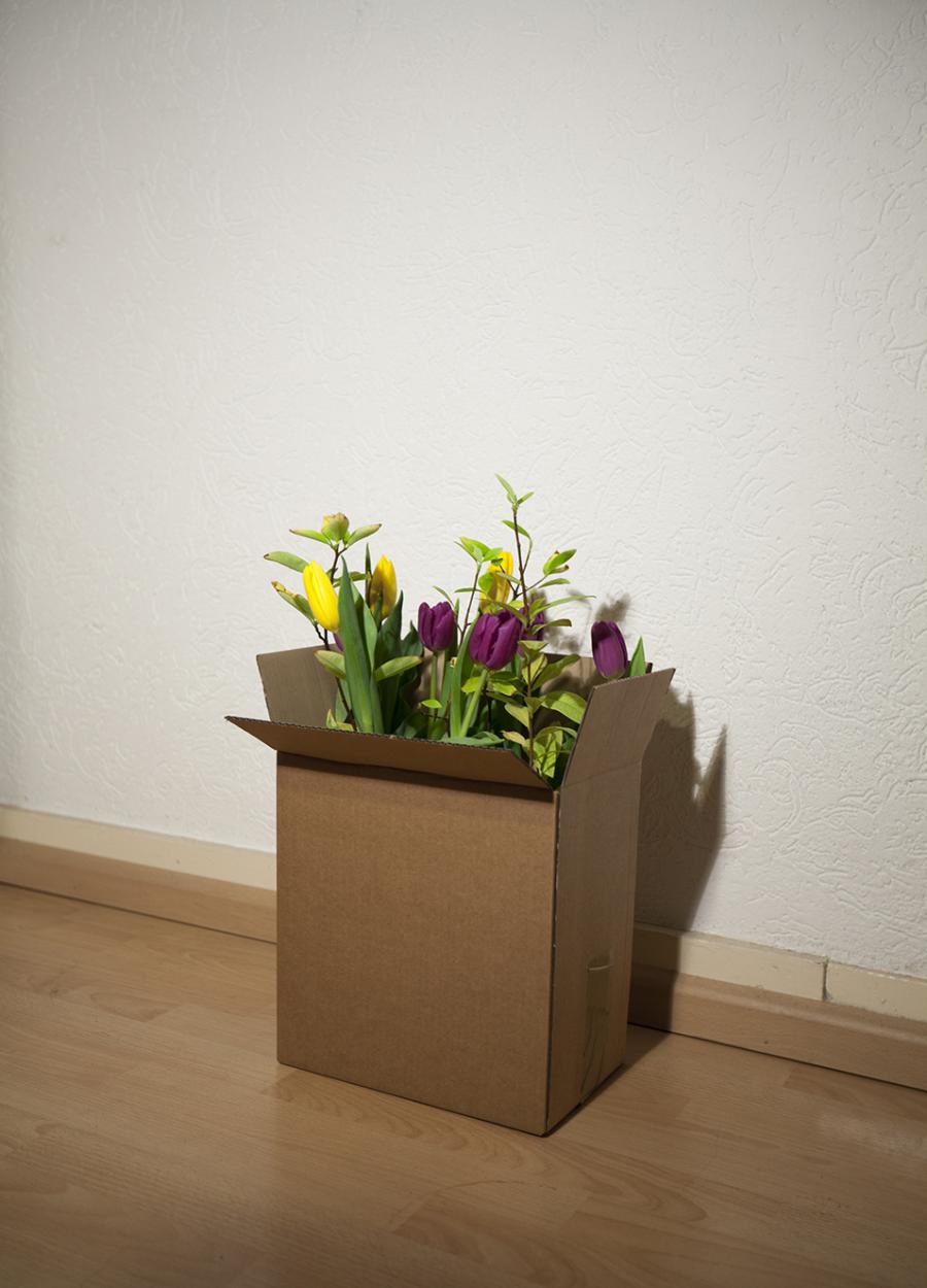 “In the mood for love, or how to move a criminal”, 2014, is a photograph showing a floral arrangement, mainly of tulips. Looks like a beautiful present, but actually it was made to transport cocaine plants needed for an installation through Europe, from Amsterdam to Paris, and Spain.